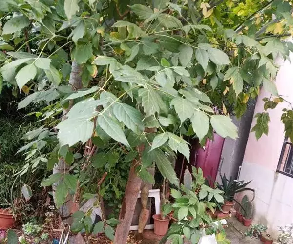 梣叶槭(学名:Acer negundo L.)是槭树科槭属植物,落叶乔木,高可达20米。树皮黄褐色或灰褐色。小枝圆柱形,冬芽小,鳞片镊合状排列。羽状复叶,小叶纸质,卵形或椭圆状披针形,叶片上面深绿色,无毛,下面淡绿色,叶柄稀疏的短柔毛淇后无毛。雄花的花序聚伞状,雌花的花序总状,小枝旁边生出,花小,黄绿色,开于叶前,雌雄异株,花丝很长,子房无毛。小坚果凸起,4-5月开花,9月结果。