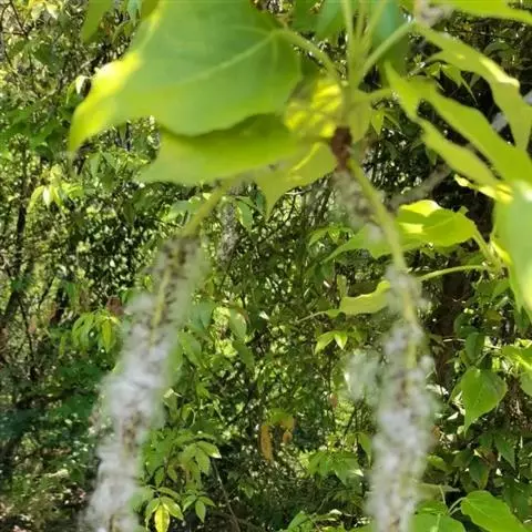 花单性,雌雄异株,先于叶开放;雄花序最初成紧凑的束形,后花梗则极度伸长,长达4-7厘米,有毛,下垂成伞房状;花萼狭钟形,5裂,被柔毛,萼片小,长1.5厘米,雄蕊5,长3-3.5毫米,花丝伸长,毛发状,花药线形;雌花序下垂,疏总状花序;萼片基部合生;子房初被毛,后渐无毛。