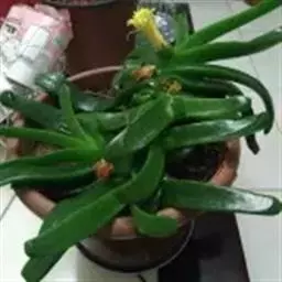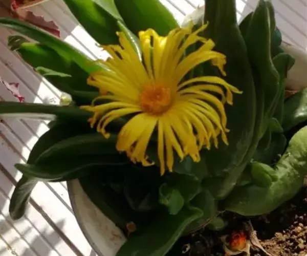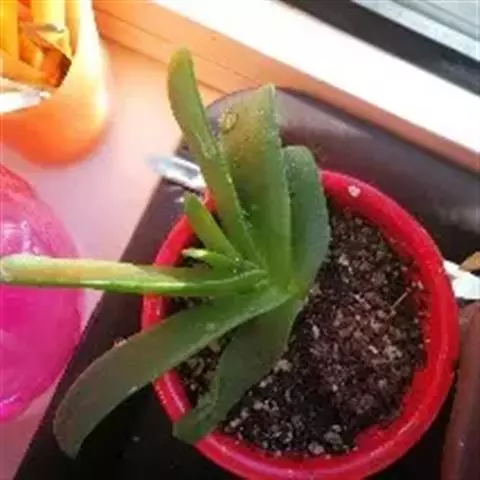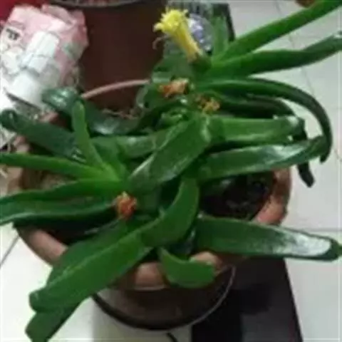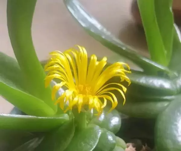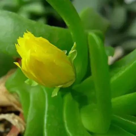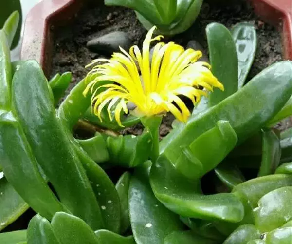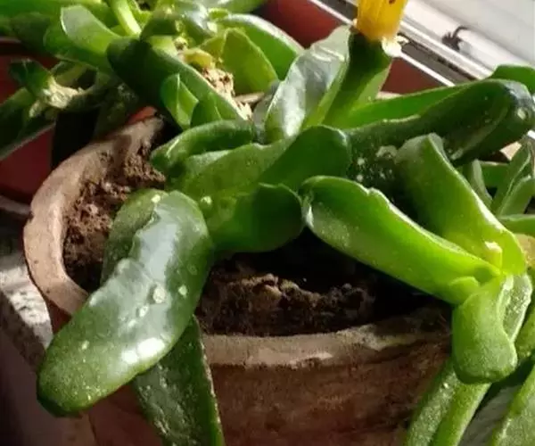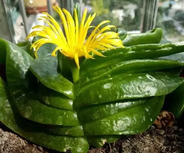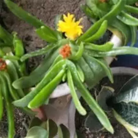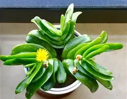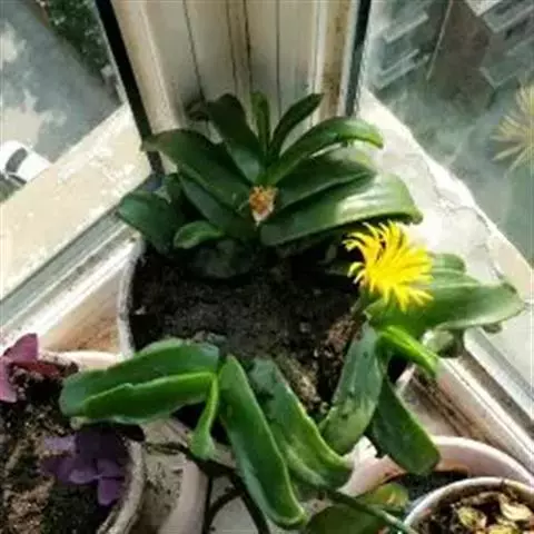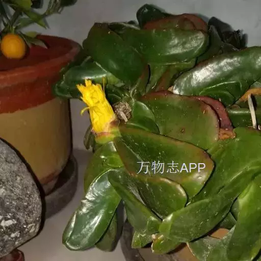 佛手掌,极短,肉质叶舌状,对生2裂,长约10cm,宽2-3,鲜绿色,平滑有光泽。叶端略向外反转,株形像佛手。秋冬季开花,花自叶丛中抽出,花冠金黄色。