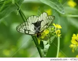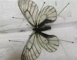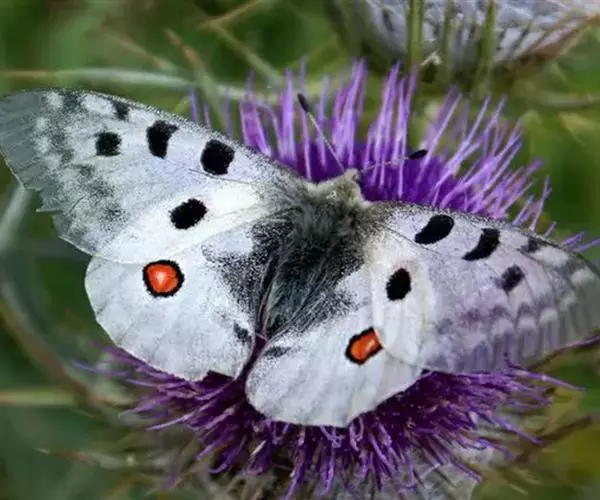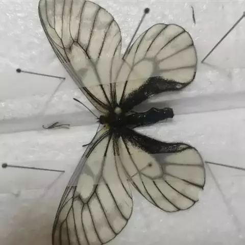 阿波罗绢蝶是一种大型蝶类,以秀丽清雅而倍受人们喜爱。翅展7-8.4厘米。翅白色或淡黄白色。半透明。前翅中室中部及端部有大黑斑,中室外有2枚黑斑,外缘部分黑褐色,亚外缘有不规则的黑褐带,后缘中部有1枚黑斑。后翅基部和内缘基半部黑色;前缘及翅中部各有1枚红斑,有时有白心,周围镶黑边;臀角及内侧有2枚红斑或1红1黑斑,其周围镶黑边;亚缘黑带断裂为6个黑斑。翅反面与正面相似,但翅基部有4枚镶黑边的红斑,2枚臀斑也为具黑边的红斑。雌蝶色深,前翅外缘半透明带及亚缘黑带较雄蝶宽而明显,后翅红斑较雄蝶大而鲜艳。