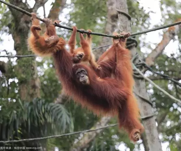 猩猩母子 亚洲猩猩一度广泛分布在东南亚和中南半岛,现仅存于婆罗洲和苏门答腊岛北部的热带山地森林、低地龙脑香森林、热带泥炭沼森林和热带卫生保健林中。现发现湿地森林生境生活着高密度的红毛猩猩群;苏门答腊岛北部则有大约9000只红毛猩猩存活,它们主要活动在一个国家公园的四周;另有10000~15000只红毛猩猩生活在婆罗洲岛,主要活动在八个隔离区。