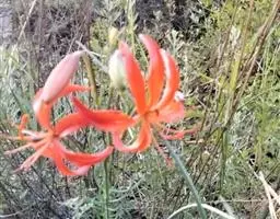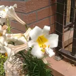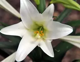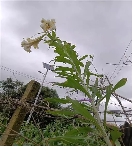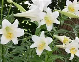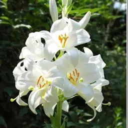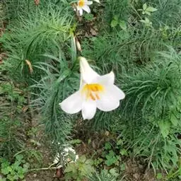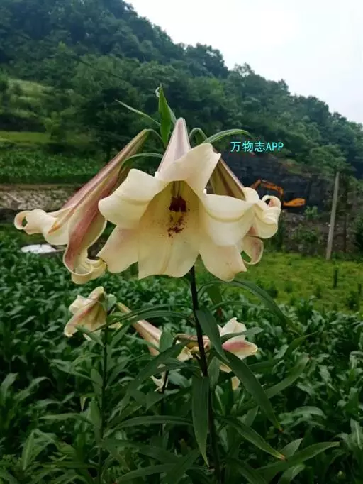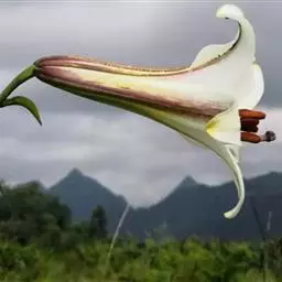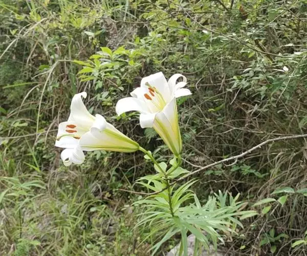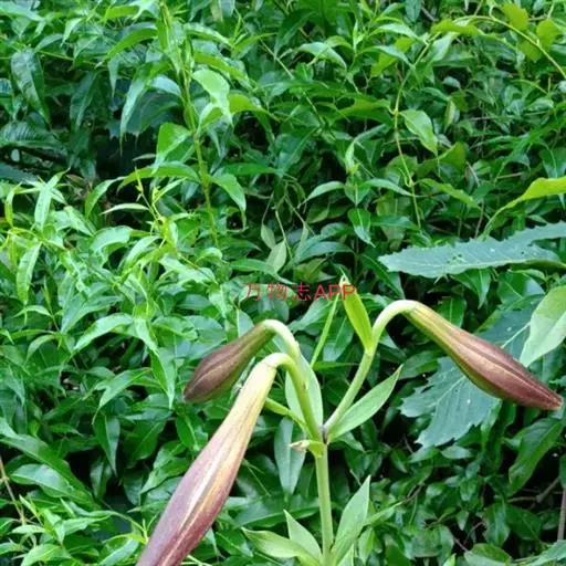 野百合(学名:Lilium brownii F.E.Br. ex Miellez):鳞茎球形,直径2-4.5厘米;鳞片披针形,长1.8-4厘米,宽0.8-1.4厘米,无节,白色。茎高0.7-2米,有的有紫色条纹。叶散生,具5-7脉,全缘,两面无毛。花单生或几朵排成近伞形;花喇叭形,有香气,乳白色,外面稍带紫色,无斑点,向外张开或先端外弯而不卷。蒴果矩圆形,有棱,具多数种子。花期5-6月,果期9-10月。