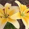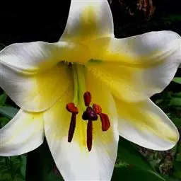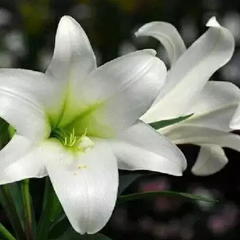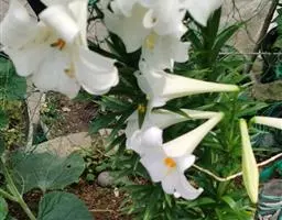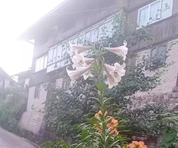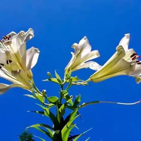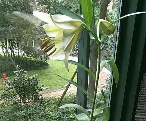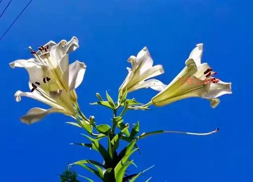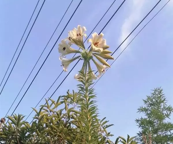花单生或几朵排成近伞形;花梗长3-10厘米,稍弯;苞片披针形,长3-9厘米,宽0.6-1.8厘米;花喇叭形,有香气,乳白色,外面稍带紫色,无斑点,向外张开或先端外弯而不卷,长13-18厘米;外轮花被片宽2-4.3厘米,先端尖;内轮花被片宽3.4-5厘米,蜜腺两边具小乳头状突起;雄蕊向上弯,花丝长10-13厘米,中部以下密被柔毛,少有具稀疏的毛或无毛;花药长椭圆形,长1.1-1.6厘米;子房圆柱形,长3.2-3.6厘米,宽4毫米,花柱长8.5-11厘米,柱头3裂。