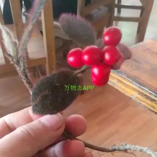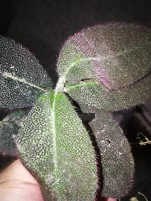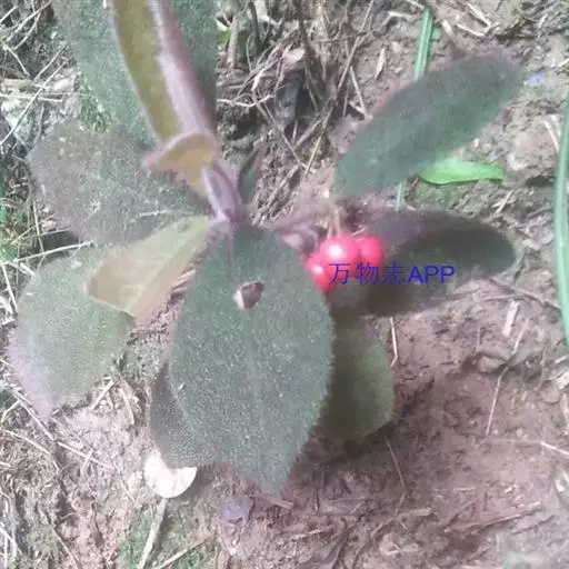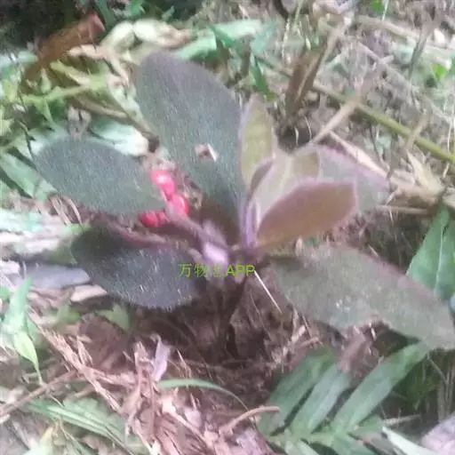 虎舌红 该种与莲座紫金牛相似,但该种植株较高,茎较长,叶面的毛基部隆起如小瘤,极易区别。该种有的个体全株为紫红色,有的则为绿色,故有红毛毡与白毛毡之称。