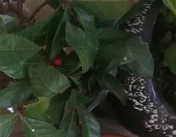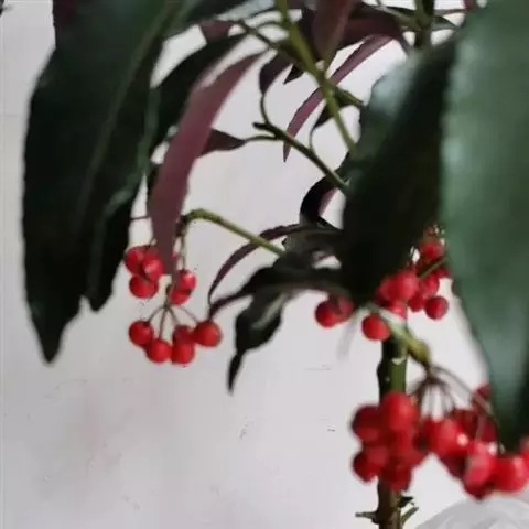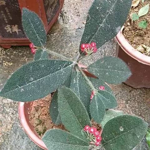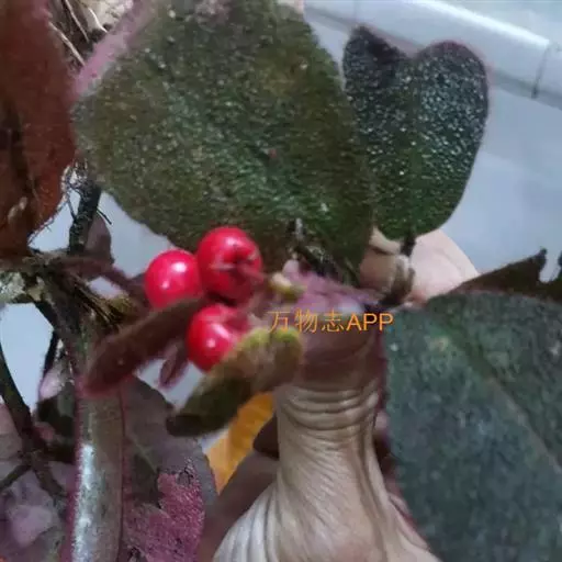 虎舌红 虎舌红株形紧凑,果、叶可全年观赏,花小淡雅,果呈球形、黄豆大小、红色,全年轮番挂果,可长期放置室内;叶面有紫红色茸毛,观赏叶片从不同角度观察呈现光泽多彩,因果实红红火火,象征喜庆吉祥,以其观果观叶的珍贵特色,在1999 年“昆明世界园艺博览会”荣获室内观赏叶植物大奖第1 名。