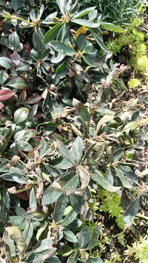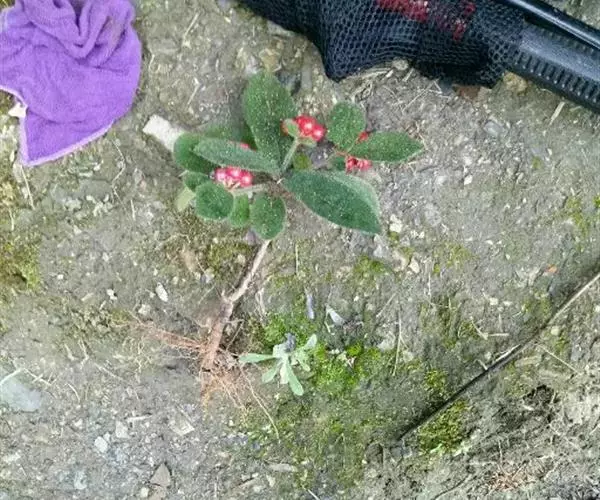 矮小灌木,具匍匐的木质根茎,直立茎高不超过15厘米,幼时密被锈色卷曲长柔毛,以后无毛或几无毛。叶互生或簇生于茎顶端,叶片坚纸质,倒卵形至长圆状倒披针形,顶端急尖或钝,基部楔形或狭圆形,长7-14厘米,宽3-4(-5)厘米,边缘具不明显的疏圆齿,边缘腺点藏于毛中,两面绿色或暗紫红色,被锈色或有时为紫红色糙伏毛,毛基部隆起如小瘤,具腺点,以背面尤为明显,侧脉6-8对,不明显;叶柄长5-15毫米或几无,被毛。