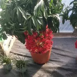 通过播种育苗是获取大量苗木、低成本扩大生产的有效途径。在保护地栽培条件下,一年四季可播种繁殖。虎舌红常年有果,为种子采收适时繁育提供了良好的种质资源条件。大量采种时机有两个集中期。一是10月中旬前后,在不作为商品苗出售时的种苗中采摘一批红熟的种子,减轻植株营养负荷,有利于植株的茎、根继续生长和越冬;二是翌年4月底,采摘一批未售的商品苗种子,以利提高植株的生长速度。另外,在枝头上常年蓄留一些种子,既增加观赏价值又便于随时往外调运,播种时选择肥沃的腐叶土、泥炭、沙作繁殖基质,播种20-25天发芽,用喷水装置或喷雾器喷水,不使种子根系外露,一般30天左右长出叶片,在发芽和幼苗2个月阶段,必须保证温度在12-35℃,以利小苗正常生长。待小苗长有2片真叶即可移栽上盆。种子也可不采摘,种子在枝头上自行发芽,掉人盆内长出小植株。