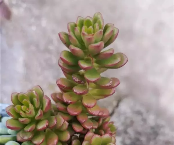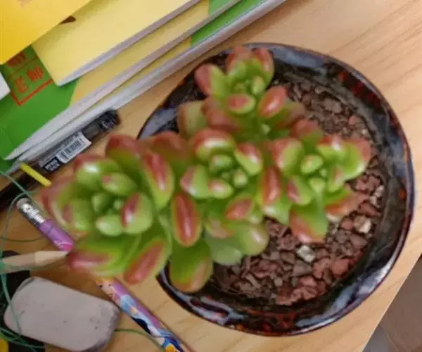 乔伊斯·塔洛克,多年生小型多肉草本植物。植株直立,易生侧芽,且侧芽多,常形成枝繁叶茂的群生株。叶子匙形,或舟形,叶面较平滑,中间略凹陷,叶背面凸起,龙骨不明显,交互对生或轮生,叶端钝,无小尖,全叶披毫毛。5-10月,一般以绿为叶的主色调,叶缘稍有红晕;11月至翌年4月,叶的基色调以红为主,在重组阳光、大温差和排水良好介质的共同影响下叶片变红。花期4-5月,聚伞花序,开花5瓣,星形,外瓣粉色,内瓣白色,花梗红色。
