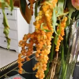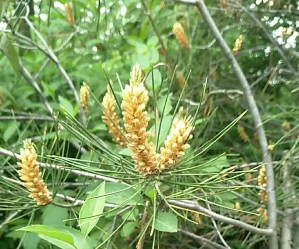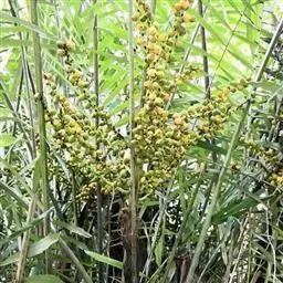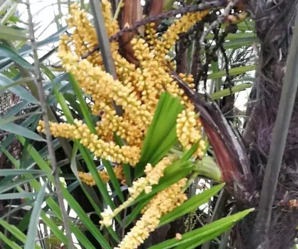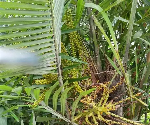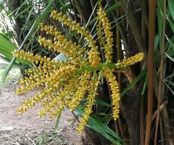 花序生于叶间,长30-50厘米,多分枝,分枝长约30厘米,螺旋状排列于花序轴上;花雌雄同株;雄花稍大,长约1.5厘米,黄色,有香气,萼片3,覆瓦状排列成杯状,花瓣3,长椭圆形,长1.5厘米,雄蕊约40枚,不具芒尖;雌花近球形,花萼近圆形,花瓣三角形,长约6毫米,宽5毫米。果实近球形,钝三棱,充分成熟时为红色,直径约1.8厘米,高1.7厘米。种子3颗,通常有1种子发育不全,黑褐色,钝三棱状,长1厘米,宽0.8厘米,厚0.6厘米,胚乳均匀,胚背生。花期5-6月,果期11-12月。