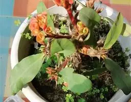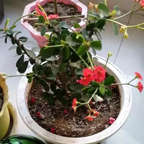 虎刺梅:别称铁海棠,是蔓生灌木植物。茎多分枝,长60-100厘米,直径5-10毫米,具纵棱,密生硬…