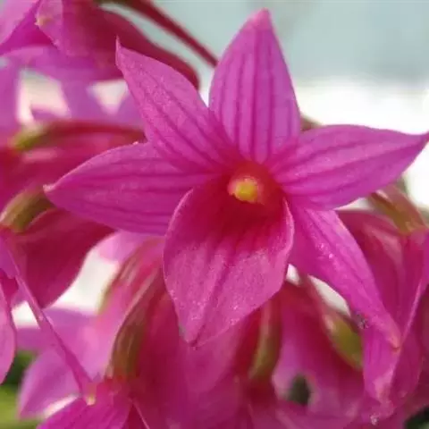 苞舌兰:假鳞茎扁球形,通常粗1-2.5厘米,被革质鳞片状鞘,顶生1-3枚叶。叶带状或狭披针形,…