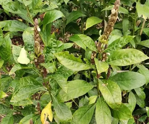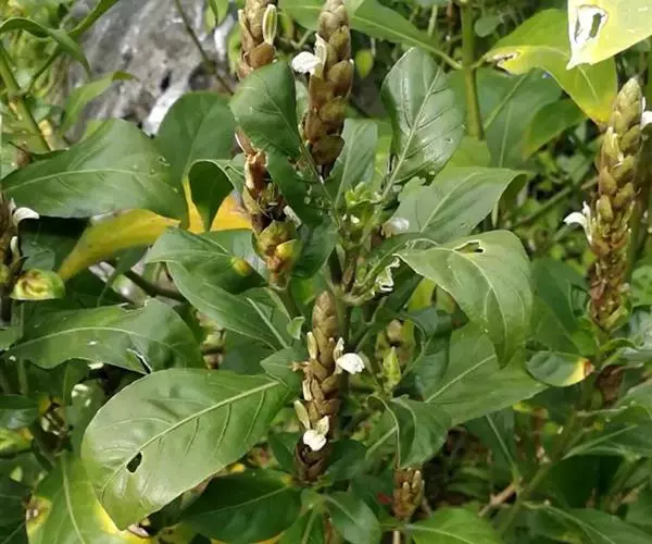 叶纸质,椭圆形或倒卵形,长10-17厘米,宽3-6厘米,顶端短渐尖或急尖,基部渐狭,干时草黄色或绿黄色;常有颗粒状隆起;中脉粗大,腹面稍凸,背面呈半柱状凸起,侧脉每边6-7条,两面近同等凸起,在背面半透明;叶柄长0.5-1.5厘米。穗状花序顶生,密生;苞片大,覆瓦状重叠,阔卵形或近圆形,长1-1.5厘米,宽约1厘米,被微柔毛;萼裂片披针状线形,长约3毫米;花冠白色或粉红色,长1.5-1.6厘米,上唇长圆状卵形,下唇浅3裂。蒴果长约8毫米,被柔毛。花期冬季。