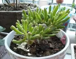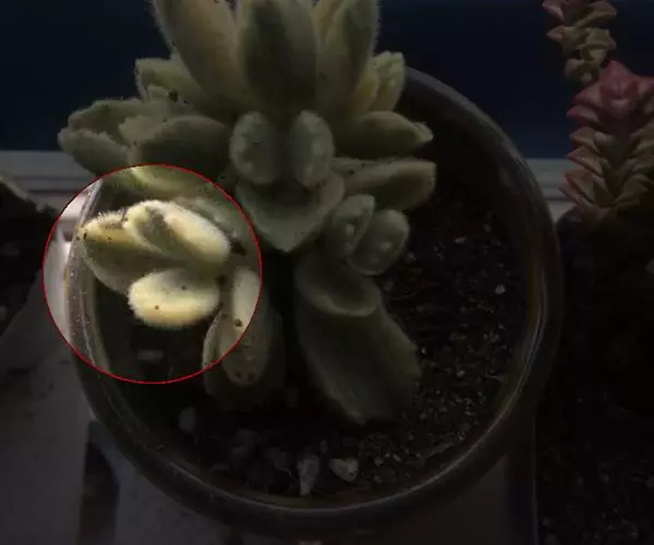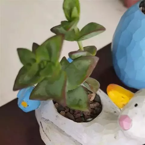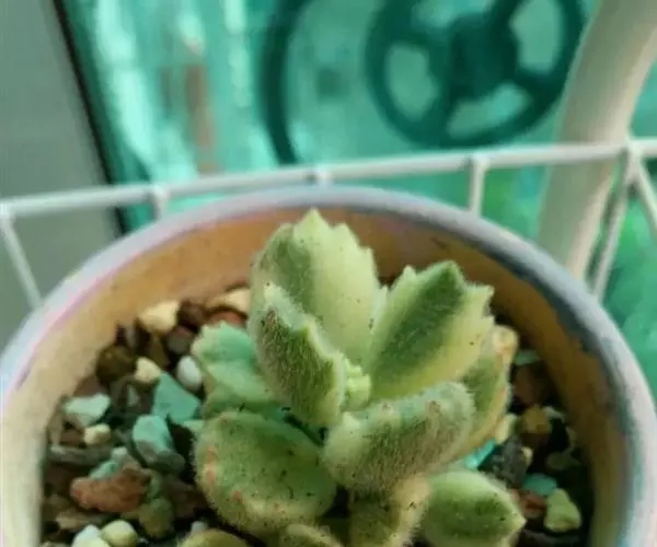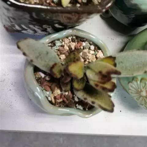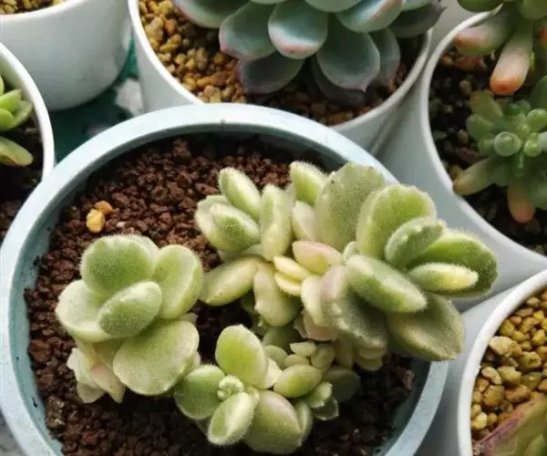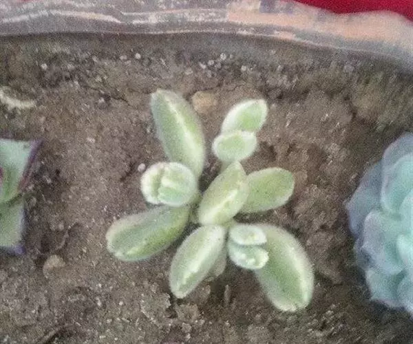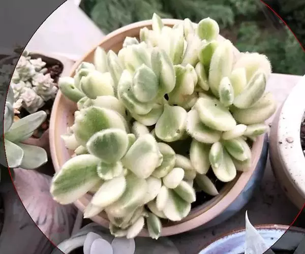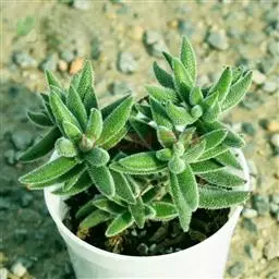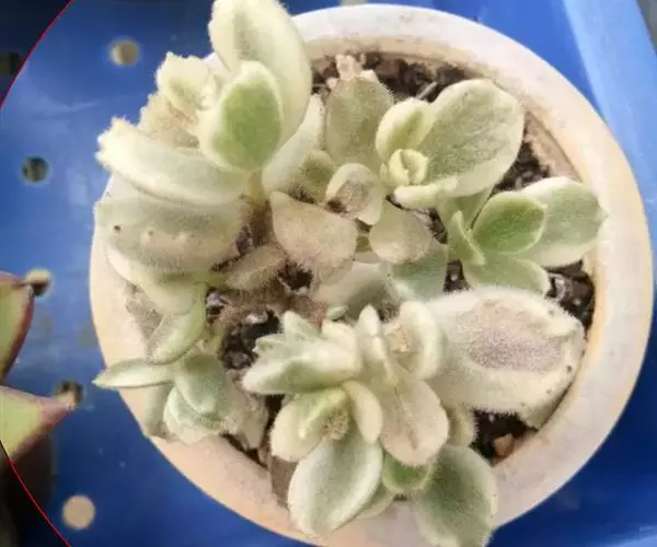 植株呈多分枝的矮小灌木状,老茎深褐色,幼枝灰色,肥厚多肉的叶片交互对生,叶卵形,长2~3厘米,宽1~1.5厘米,顶部的叶缘具缺刻。叶片表面密生白色的细短绒毛,叶尖有几个小爪强光下会变红。
