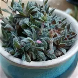 熊童子白锦(学名:Cotyledon ladismithiensis var iegata),是景天科银波木属多年生肉质草本植物,熊童子白锦总状花序,花为微红色,原产非洲的纳米比亚。