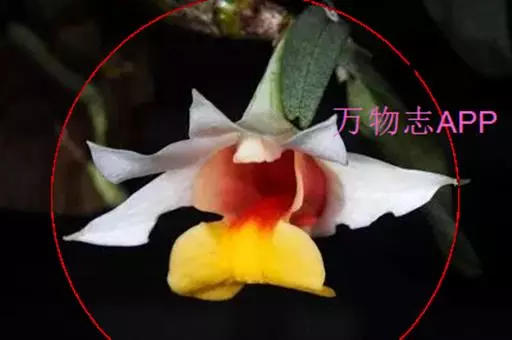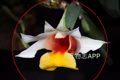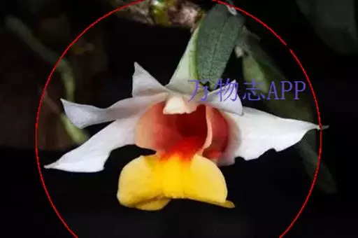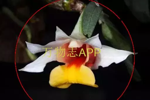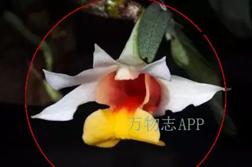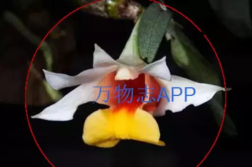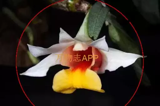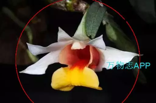 总状花序顶生或近茎的顶端发出,花序轴长5-7毫米,具1-3朵花;花序柄长2-3毫米;花苞片膜质,卵状披针形,长7-10毫米;花梗和子房长约2.5厘米;花开展,除唇瓣的中裂片金黄色和侧裂片的内面橘红色外,均为白色;中萼片卵状披针形,长约2.5厘米,宽约1厘米,先端急尖,具7条脉;侧萼片斜卵状披针形,长2.5厘米,宽1厘米,先端急尖,具7-8条脉;萼囊宽圆锥形,长约1厘米。
