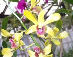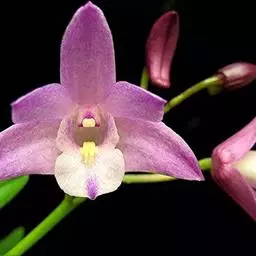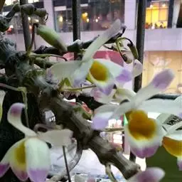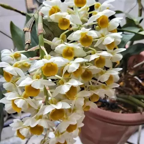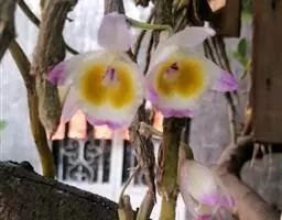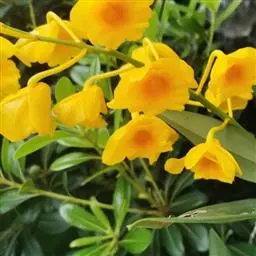 矮石斛(学名:Dendrobium bellatulum Rolfe):茎直立或斜立,粗短,纺锤形或短棒状,具许多波状纵条棱和2-5节。叶2-4枚,近顶生,革质,舌形,卵状披针形或长圆形。总状花序顶生或近茎的顶端发出,具1-3朵花;花开展,除唇瓣的中裂片金黄色和侧裂片的内面橘红色外,均为白色;花瓣倒卵形,等长于中萼片而较宽,先端近圆形,具5条脉;唇瓣近提琴形,长约3厘米,3裂。花期4-6月。