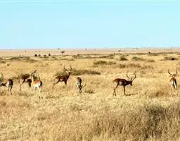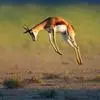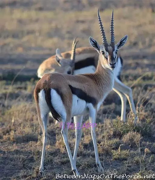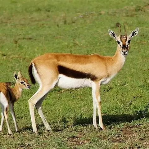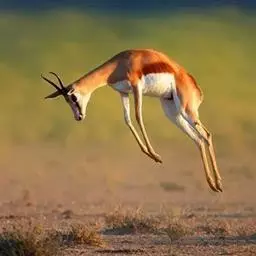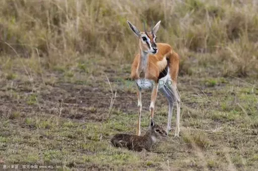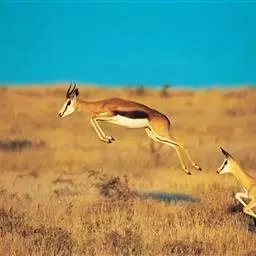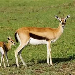 汤普逊瞪羚是诸多瞪羚中最出名的一种,它和我国的藏羚羊 瞪羚 、蒙古黄羊同属一类。它们身材娇小,体态优美,是草原食肉动物渴望的美餐。汤普逊瞪羚对付强敌的办法就是“逃跑”。非洲草原上,它的速度仅次于猎豹。而且它的纵身一跳可高达3m,跨度9m。雄性瞪羚是好斗的,尤其表现在争夺伴侣和领土上,他们通过对抗或者彼此用角的顶撞来决定谁是胜利者,战败者将会离开此地去寻找新的领地。小瞪羚出生五分钟后,就能跟着母亲跑动了,六周左右,小瞪羚就已经是短跑健将了。这是他们天生的本领,因为周围的猛兽太多了,不如此就难以存活,小瞪羚还有一种保护自己的方法,就是保持低调,躲在草丛中,这个方法十分管用,就连强大的猎豹,也无法发现它,再加上小瞪羚还未发育成熟,身上也没有过重的气味,瞪羚母亲还经常舔小瞪羚,让它身上仅有的一点气味也消失不见,让它更不容易被发现。汤普逊瞪羚胆小而敏捷,一旦发现危险,就会撒开长腿急速奔跑,速度可达每小时90km。羚羊的寿命较短,一般不超过20岁。瞪羚虽然也是个奔跑健将,但它比不上自己的仇敌猎豹。两个同样善跑的动物为了各自的生存,常常展开“追逐战”。但往往猎豹在汤普逊瞪羚的几次突然转向后,只能望“羊”兴叹了。瞪羚能飞快的逃离捕食者。当危险临近时,它们四条腿直直的向下伸,身体腾空高高跃起。这种被称为腾跃的动作,用来警告其他瞪羚有危险,同时也能起到迷惑敌人的作用。