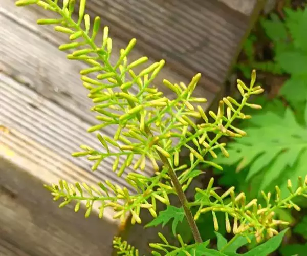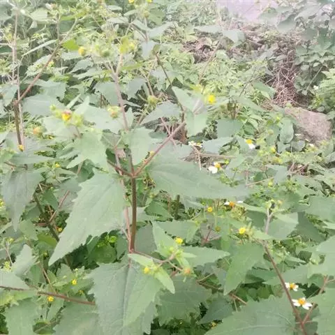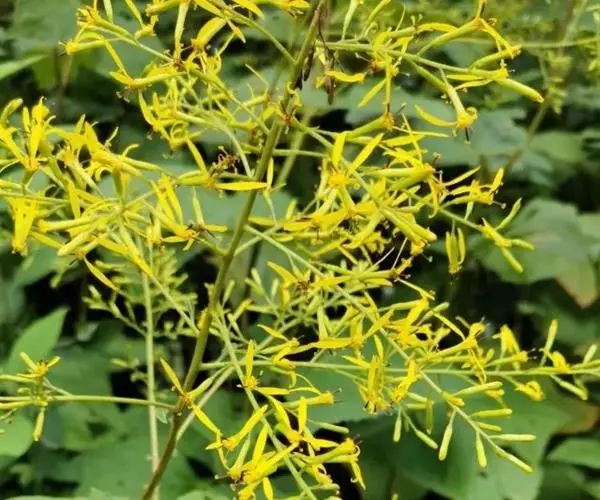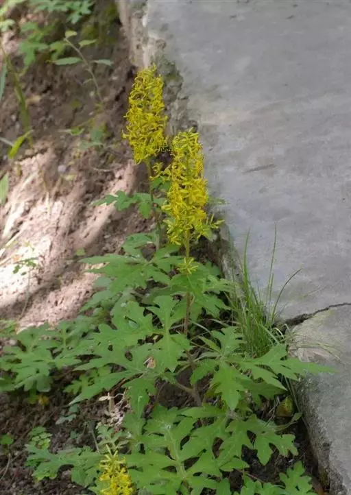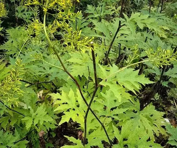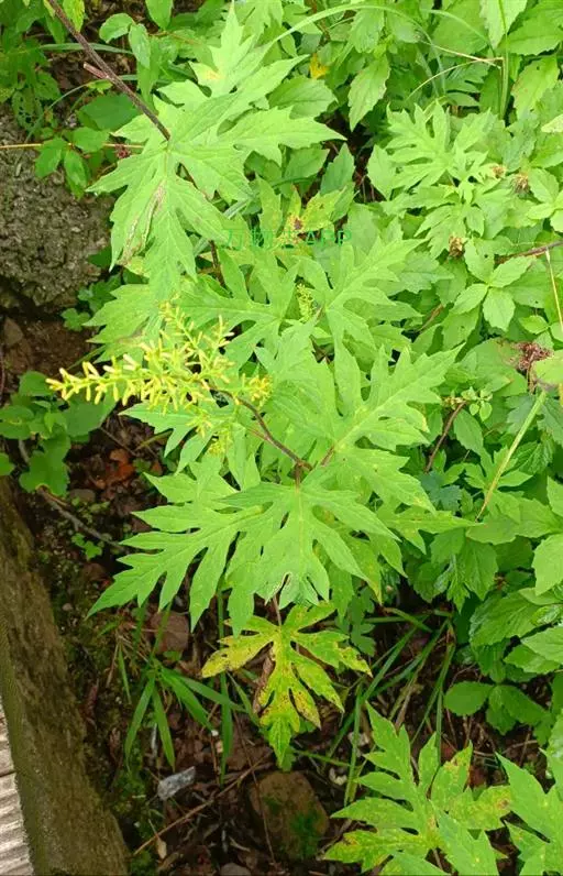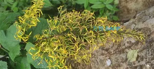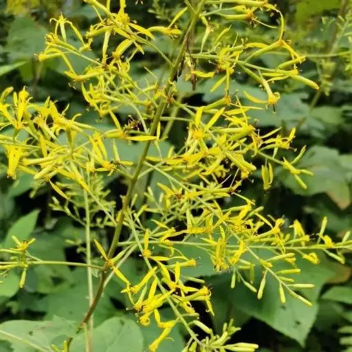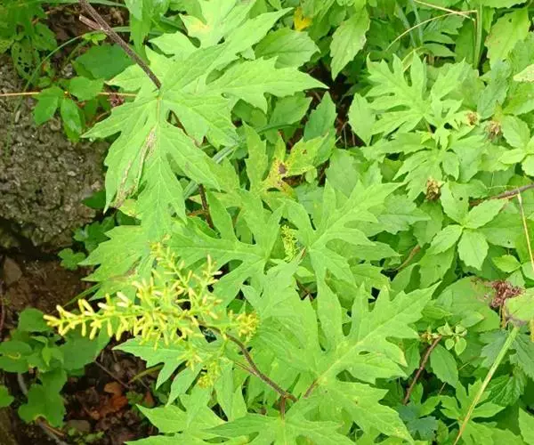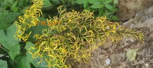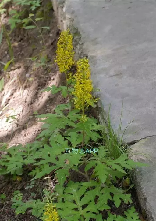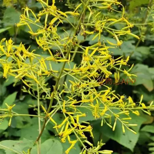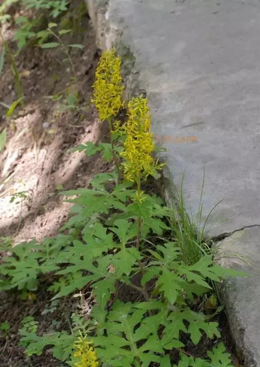形态特征:根状茎块状,径1—1.5厘米,具多数纤维状根。茎粗壮,中空,高50—100厘米,基部径5—6毫米, 不分枝,幼时被疏蛛丝状毛,或基部无毛,上部被褐色腺状短柔毛。叶具柄,下部茎叶花期常脱落,中部叶片厚纸质,卵形或卵状心形长10—16厘米,宽10—15厘米,顶端具小尖,羽状深裂,每边各有侧裂片3—4,侧裂片近对生,狭至宽长圆形,顶端具小尖,边缘常具数个小尖齿,基部截形或浅心形,上面深绿色,被疏贴生短硬毛,下面浅绿色,至少沿脉被短柔毛及疏蛛丝状毛,具明显羽状脉;叶柄较粗壮,长3—6厘米,基部扩大且半抱茎,被疏短柔毛或近无毛;上部茎叶渐小,具短柄。头状花序小,多数常排成多分枝宽塔状复圆锥状,花序轴及花序梗被黄褐色腺状短柔毛;花序梗细,长2—3毫米,具2—3个线形渐尖的小苞片。总苞圆柱状,长8—10毫米,宽1—1.5毫米,总苞片5,线状长圆形,长约8毫米,宽1—1.5毫米,顶端钝,被微毛,边缘狭干膜质。舌状花2—3个,黄色,管部长4.5毫米,舌片长圆状披针形,长13—14毫米,宽2毫米,顶端具2小齿,具4条脉;管状花4,稀7,花冠黄色,长8—9毫米,管部长2--2.5毫米,檐部漏斗状,裂片长圆状卵形,长1.5毫米,顶端渐尖。花药长圆形,长3.5—3.7毫米,基部具短尾,附片长圆状渐尖;花柱分枝弯曲,长1.5毫米,顶端钝,被乳头状微毛。瘦果圆柱形,长约3毫米,无毛,具肋;冠毛糙毛状,白色,长7—8毫米。花期7—9月。