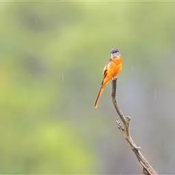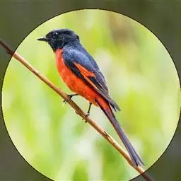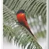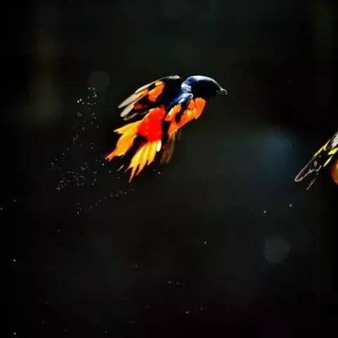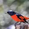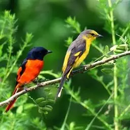 长尾山椒鸟 山椒鸟头顶至上背亮黑色,腰、尾上覆羽和下体猩红色,中央尾羽黑色,外侧尾羽具显著的红色。翅羽黑色,但有宽阔的红色翼斑,内侧数枚飞羽先端有椭圆形红斑,翼侧形成一例红点,非常美丽。嘴黑色,眼睛赤黑眶绿色,足黑色。雌乌的颜色却是黄色,而不是红色。