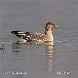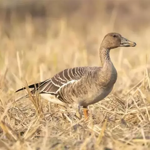 豆雁,雁形目鸭科。成鸟头、颈、背灰褐色,带淡黄色羽缘;尾上覆羽白色,尾羽黑褐色带白端,…