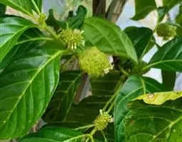 海滨木巴戟(学名:Morinda citrifolia L.)是茜草科,巴戟天属灌木至小乔木,高可达5米;茎直,枝近四棱柱形。叶片交互对生,两端渐尖或急尖,光泽,无毛,叶脉两面凸起,下面脉腋密被短束毛;托叶生叶柄间,无毛。头状花序每隔一节一个,与叶对生,花多数,无梗;萼管彼此间多少粘合,萼檐近截平;花冠白色,漏斗形,裂片卵状披针形,着生花冠喉部,花丝长约3毫米,花药内向,花柱约与冠管等长,子房有时有不育,每室胚珠1颗,胚珠略扁,聚花核果浆果状,卵形,种子小,扁,长圆形,全年花果期。