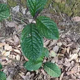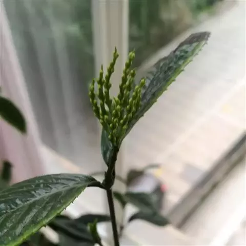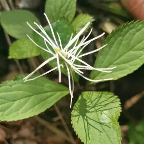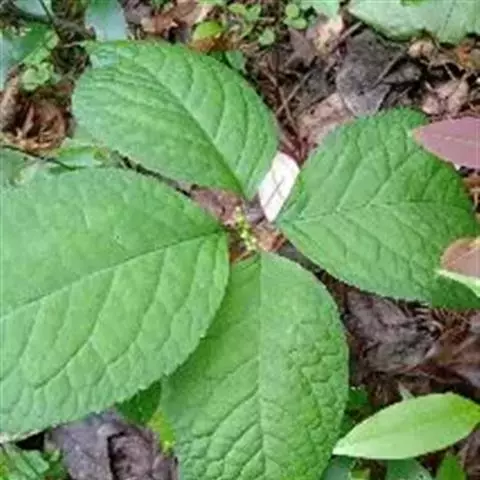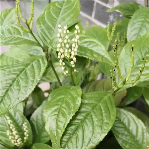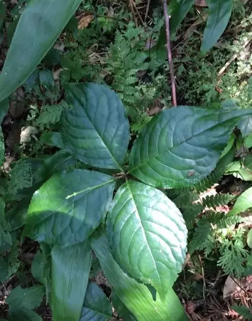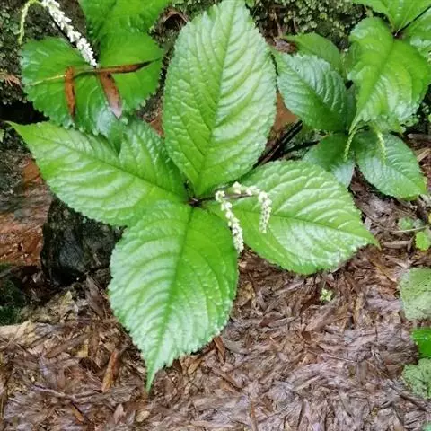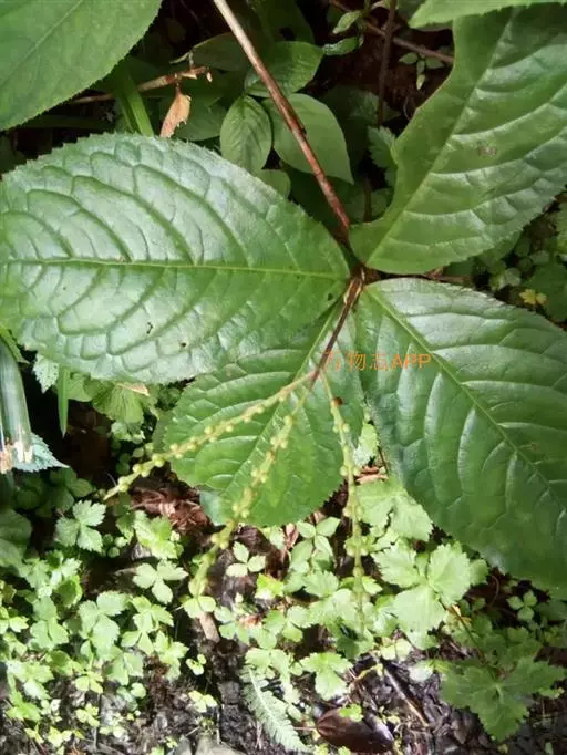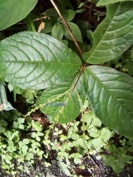 叶对生,通常4片生于茎上部,纸质,宽椭圆形、卵状椭圆形或倒卵形,长9-18厘米,宽5-9厘米,顶端渐尖,基部楔形至宽楔形,边缘具锯齿,齿端有一腺体,背面中脉、侧脉有鳞屑状毛;叶脉6-8对;叶柄长0.5-1.2厘米;鳞状叶卵状三角形,膜质。托叶小,钻形。穗状花序顶生,通常两歧或总状分枝,连总花梗长10-16厘米,总花梗长5-8厘米;苞片通常宽卵状三角形或近半圆形;花白色;雄蕊3枚,基部几分离,仅内侧稍相连,中央药隔长3毫米,有1个2室的花药,两侧药隔稍短,各有1个1室的花药,药室在药隔的基部;子房卵形,无花柱,柱头近头状。核果球形,长约3毫米,具短柄。花期4-6月,果期7-8月 。