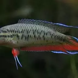叉尾斗鱼,体形与圆尾斗鱼相似。腹鳍有1根分节鳍条特别延长,雄鱼鳍条延长尤甚,尾鳍叉形。…