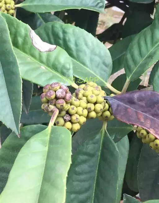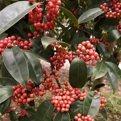 果球形,直径约7毫米,成熟时红色,宿存柱头薄盘状,基部宿存花萼盘状,伸展,外果皮厚,平滑。分核4,轮廓长圆状椭圆形,长约5毫米,宽约2.5毫米,具不规则的皱纹和尘穴,背面具明显的纵脊,内果皮骨质。花期4月,果期9-10月。
