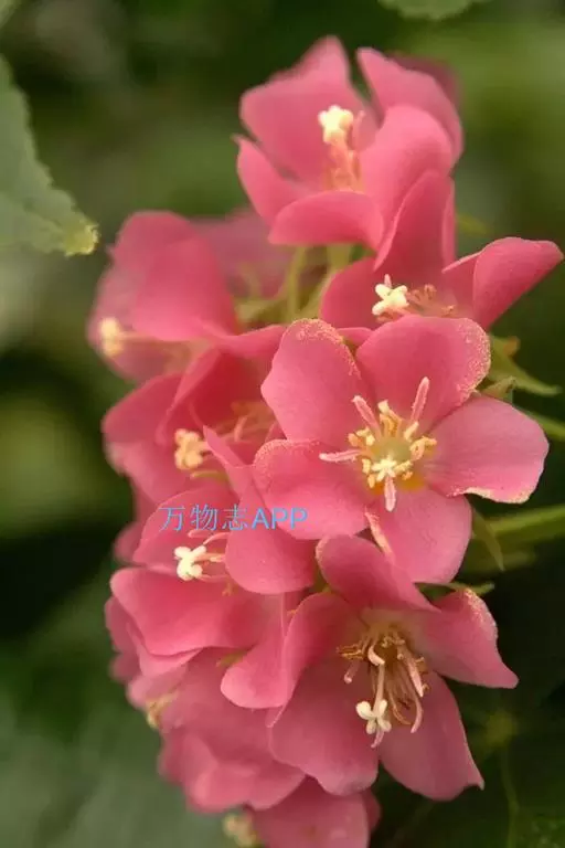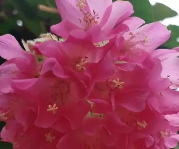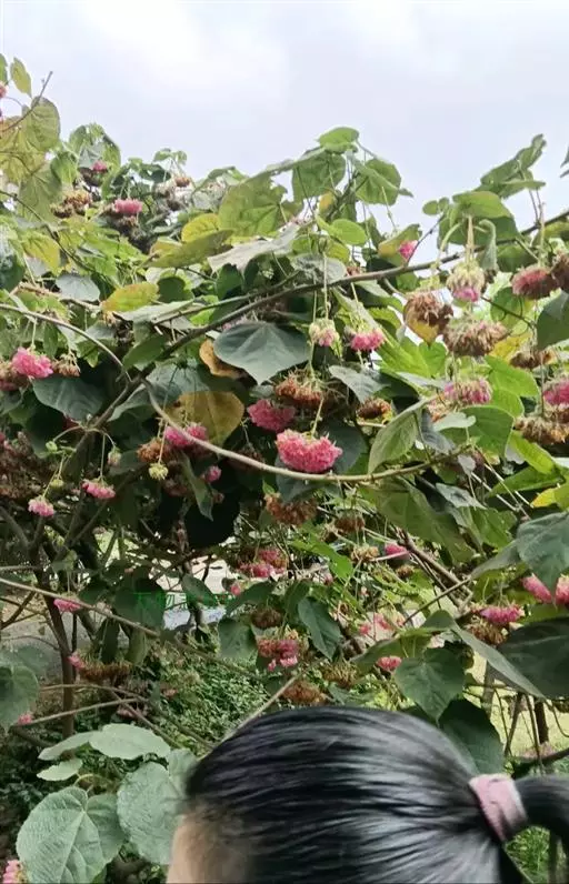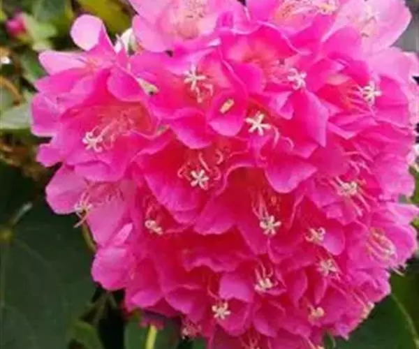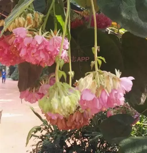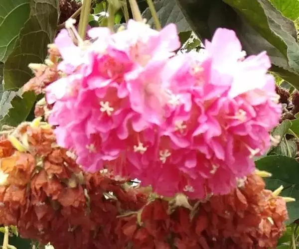 花从叶腋间伸出,悬吊著一个花苞。花为伞形花序,因此开花时会长出花轴,花轴下辐射出具等长小花梗的小花。一个花球可包含二十多朵粉红色的小花,每朵小花有瓣5块,约2.54厘米大,有一白色星顶状雄蕊及多枝雌蕊围绕。全开时聚生且悬吊而下,冬季开花,花期为由12月至翌年3月。