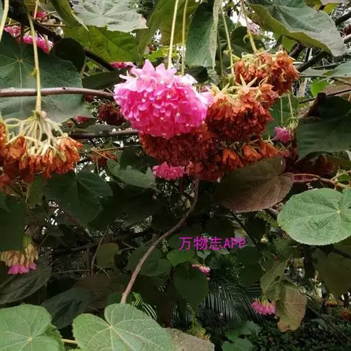 非洲芙蓉 (学名:Dombeya acutangula Cav.)是梧桐科,非洲芙蓉属常绿中型灌木或小乔木,高可达15米。树冠圆形,枝叶密集。树枝棕色,叶面质感粗糙,叶片互生,心形,叶缘顿锯齿,掌状脉,花从叶腋间伸出,伞形花序,冬季开花,12月至翌年3月开花。
