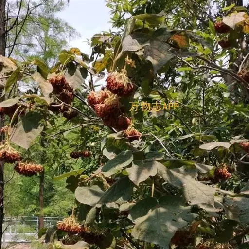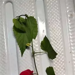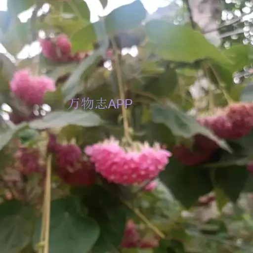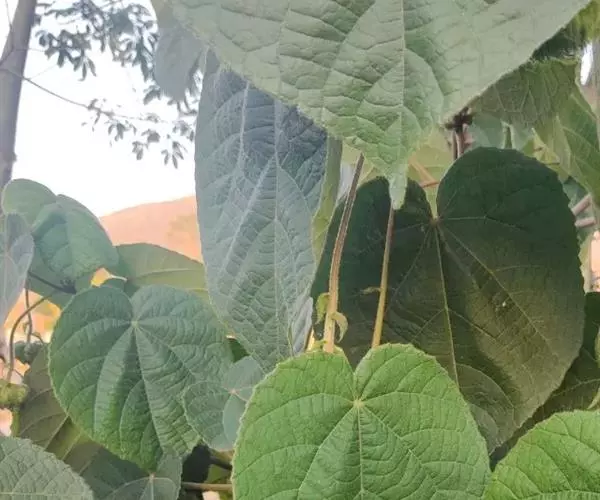 叶面质感粗糙,单叶互生,具托叶,心形,叶缘顿锯齿,掌状脉7至9条,枝及叶均被柔毛。