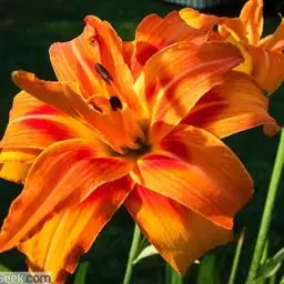 花茎自叶腋抽出,茎顶分枝开花,有花数朵,大,橙黄色,漏斗形,花被6裂。蒴果,革质,椭圆形。种子黑色光亮。