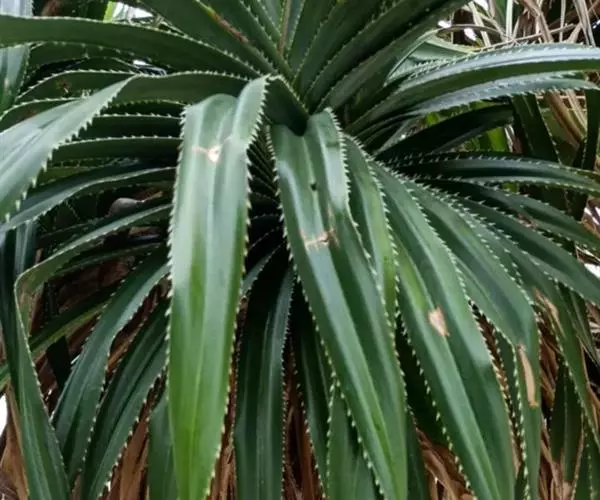 叶深绿色,硬革质,丛生于顶端,叶呈螺旋状着生,剑状长披针形,叶缘及主脉基部具有红色锐钩刺, 在同一个生长环境,雌株的叶宽较雄株宽一公分,即雌株叶宽 4 公分,雄株叶宽 3 公分。