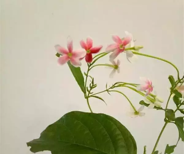 叶对生,椭圆形,两面均被灰白色柔毛。穗状花序有花12-15朵,倒挂下垂。使君子花期夏秋,在广州从5月开始,能一口气开到10到11月之后才慢慢消停,一年有2次以上的盛花期。