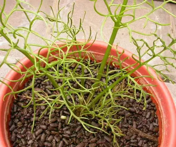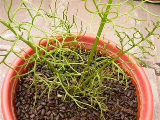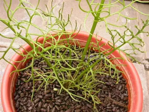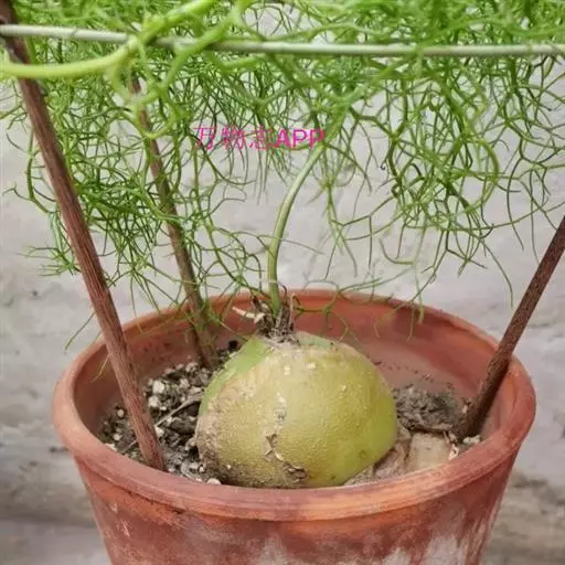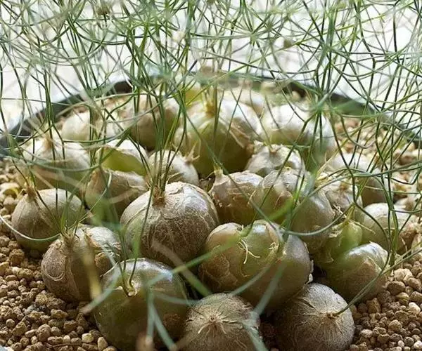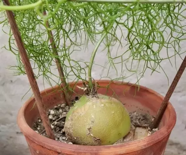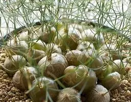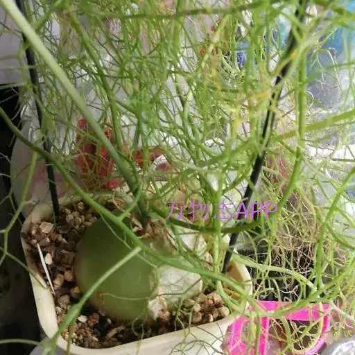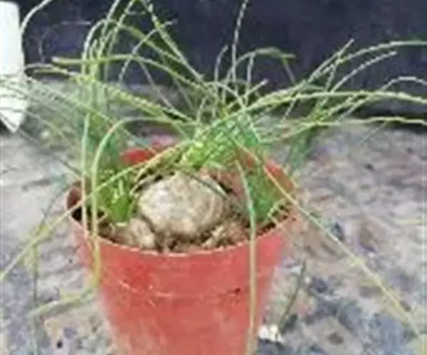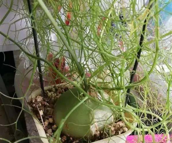 多年生草本多浆植物。植株具大型肉质球茎,洋葱状,凹陷球状,直径20-30厘米,表皮淡绿色,有光泽。根,肉质,白色,直径5毫米。春季由球茎顶部长出一对细长的对生叶,然后再簇生出绿色枝条,长2.5 -6(-10)米,缠绕攀援,枝条上有细小的绿色线形鳞片状叶,但早脱落,很小,线状披针形,具管状,寿命短,很快被真鳞片的开花茎所取代迅速。随着它的成熟,形成密集的花边分支并呈现出完整的外观。分支钻成7厘米长,直径2-7厘米。当秋天到来时,增长就会死去,进入休眠期。片狭披针形,长3-5毫米,具短刺。