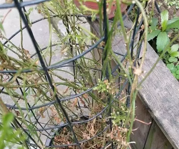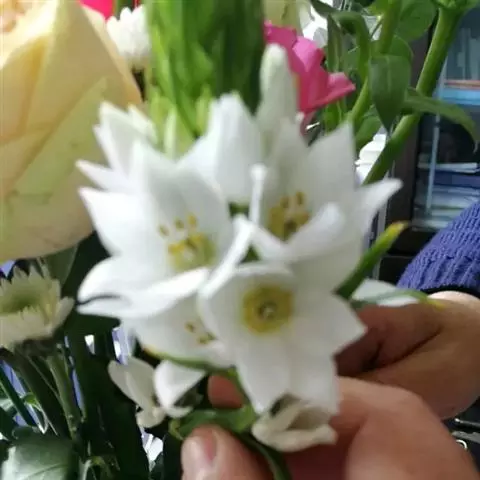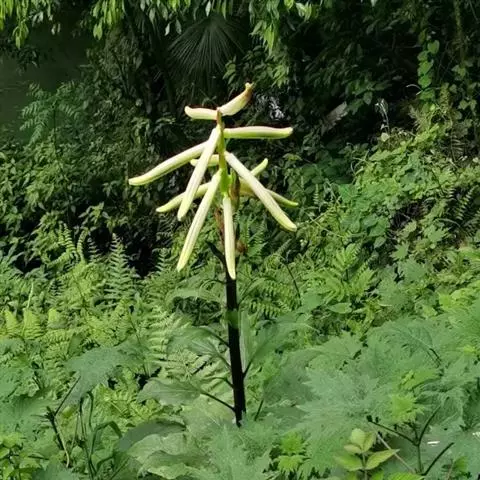 花单生,星状,六裂,绿白色,宽10-16毫米,直径0.7-0.9厘米,散在长的缠绕总状花序上;花梗成拱形,长2-10厘米。花被片游离到基部,5-9(-12)×3.5毫米,白色或绿色到黄绿色,漆皮或反折,长圆形到披针形,边缘向基部回旋,先端亚急性;花柱6,圆柱状,柱头三裂。细丝直立;仅在中度至充分的阳光下才能产生花朵,在这种情况下,每枝植物会开花数十朵花;花有难闻的气味。花期:春天,一年会开花2次。果实椭圆形,先端尖,长1.2-1.6厘米。种子黑色,长方形,有光泽,长5-10毫米。
