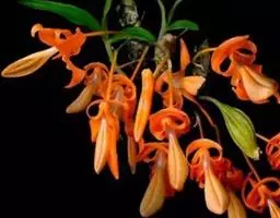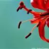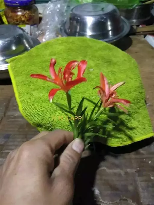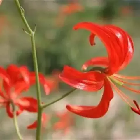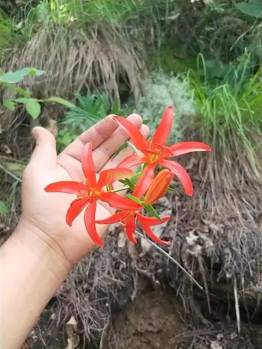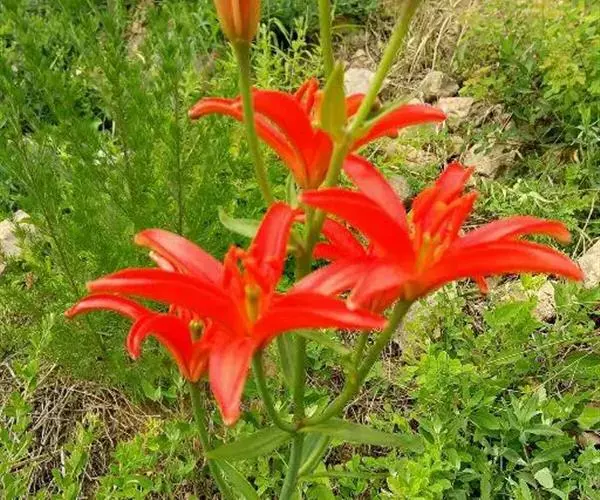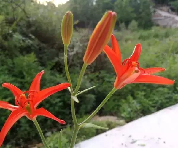 花1-5朵排成近伞形或总状花序;花梗长1.2-4.5厘米;花直立,星状开展,深红色,无斑点,有光泽;花被片矩圆状披针形,长2.2-4厘米,宽4-7毫米,蜜腺两边具乳头状突起;雄蕊向中心靠拢;花丝长1.8-2厘米,无毛,花药长矩圆形,长约7毫米;子房圆柱形,长1-1.2厘米,宽2.5-3毫米;花柱稍短于子房,柱头稍膨大。