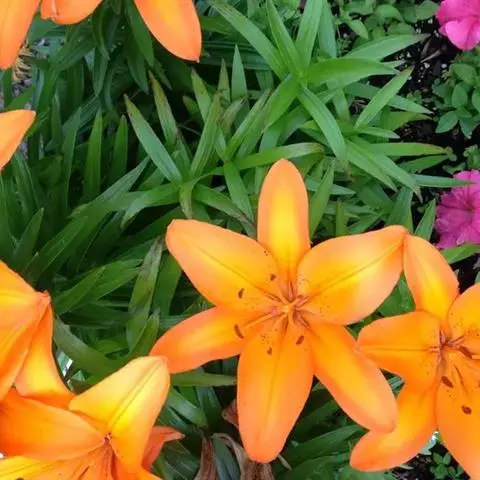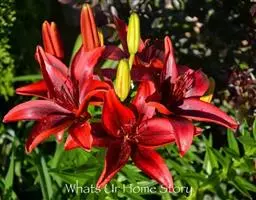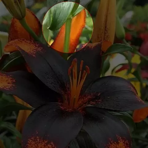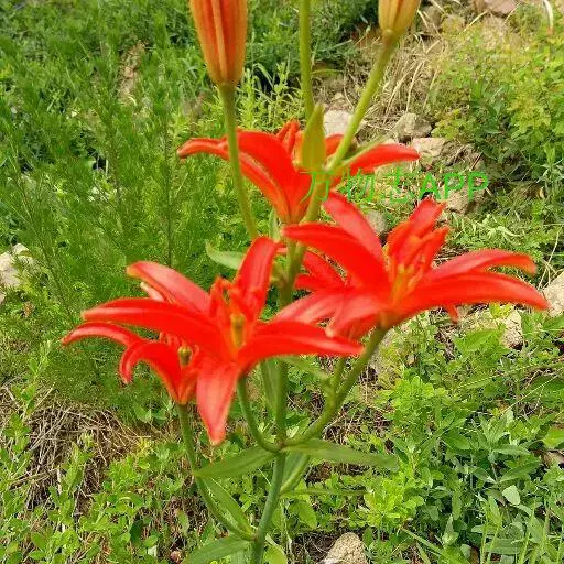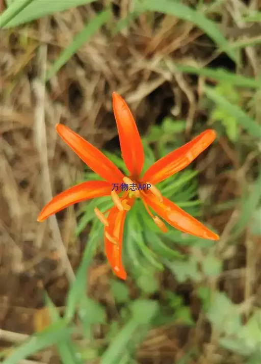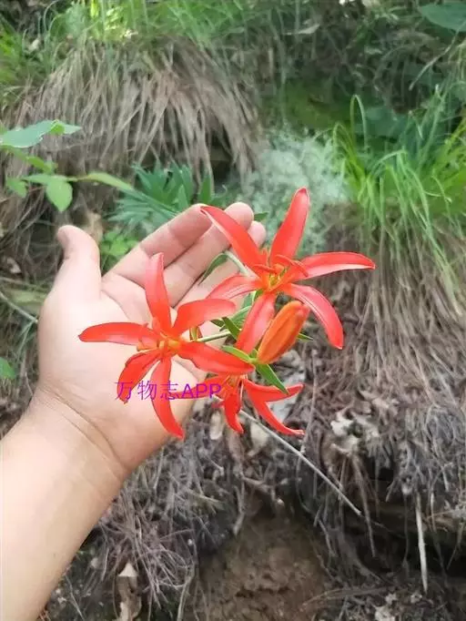 渥丹(学名:Lilium concolor Salisb.):鳞茎卵球形,高2-3.5厘米,直径2-3.5厘米;鳞片卵形或卵状披针形,白色,鳞茎上方茎上有根。茎高30-50厘米,少数近基部带紫色,有小乳头状突起。叶散生,条形,脉3-7条,两面无毛。花1-5朵排成近伞形或总状花序;花直立,星状开展,深红色,无斑点,有光泽;花被片矩圆状披针形,蜜腺两边具乳头状突起。蒴果矩圆形。花期6-7月,果期8-9月。