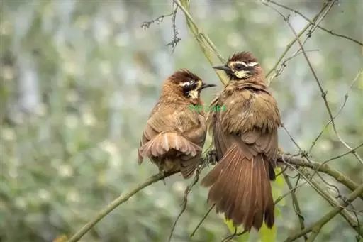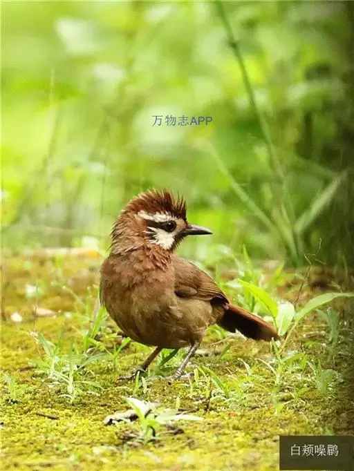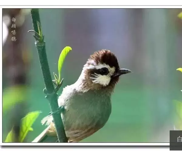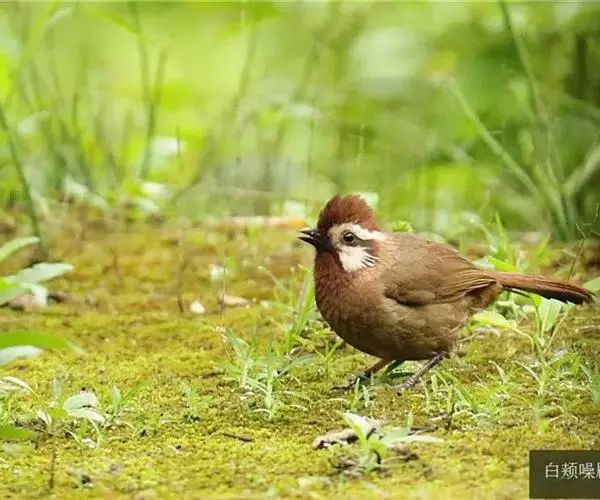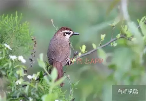 白颊噪鹛(学名:Pterorhinus sannio):中型鸟类,体长21-25厘米。雌雄羽色相似。前额至枕深栗褐色,眉纹白色或棕白色、细长,往后延伸至颈侧。背、肩、腰和尾上覆羽等其余上体包括两翅表面棕褐或橄榄褐色,尾栗褐或红褐色,飞羽暗褐色,外翈羽缘沾棕。颊、喉和上胸淡栗褐色或棕褐色,下胸和腹多呈淡棕黄色或淡棕色,两胁暗棕色。特征明显,野外容易识别。 相似种画眉眼周白色,颊不为白色,明显可与之区别。