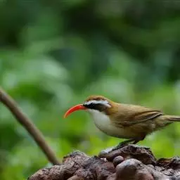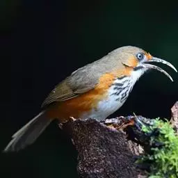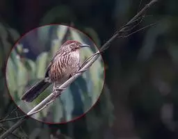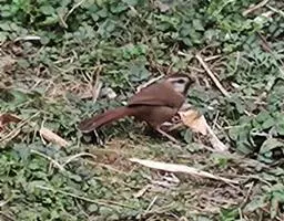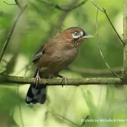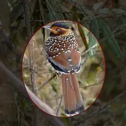 大噪鹛:中型鸟类,体长32-36厘米。额至头顶黑褐色,背栗褐色满杂以白色斑点,…