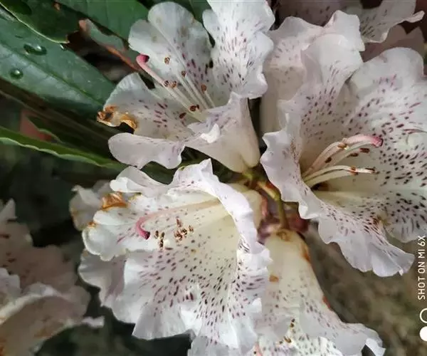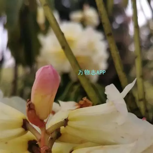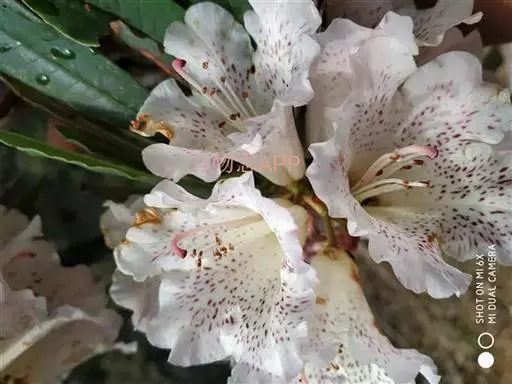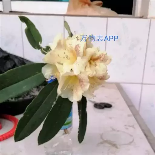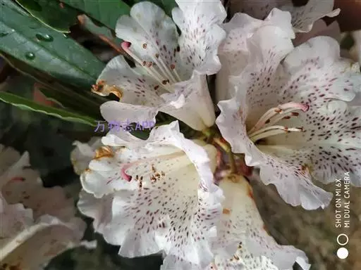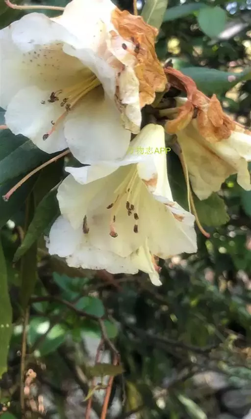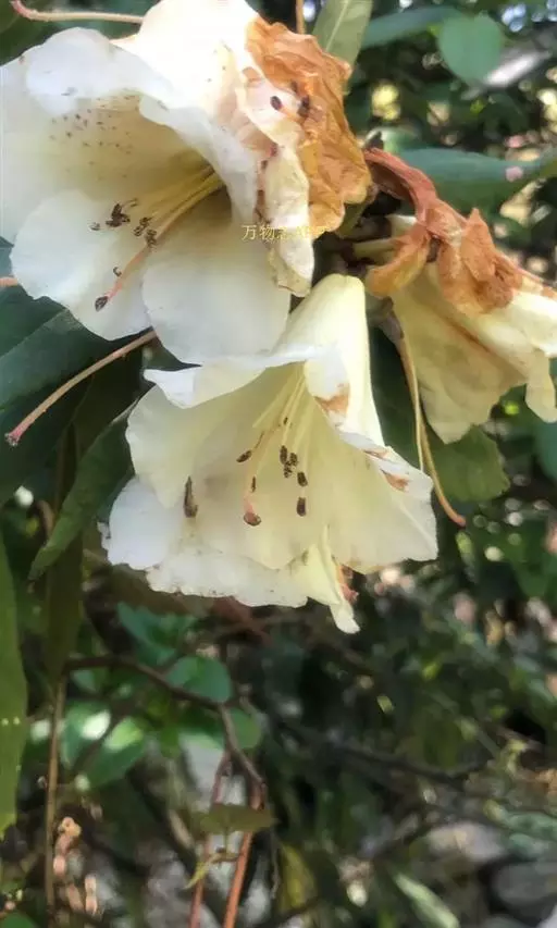 露珠杜鹃(学名:Rhododendron irroratum Franch.):灌木或小乔木,高约2-9米;小枝粗壮,直径约4-5毫米;幼枝有薄层绒毛和腺体,以后逐渐脱落;老枝光滑。叶多密生于枝顶,革质,椭圆形、披针形或长圆状椭圆形。总状伞形花序,有7-15花;花冠管状或钟状,长3-4厘米,淡黄色、白色或粉红色,有黄绿色至淡紫红色斑点,5裂,裂片半圆形。蒴果圆柱状。花期3-5月,果期9-10月。