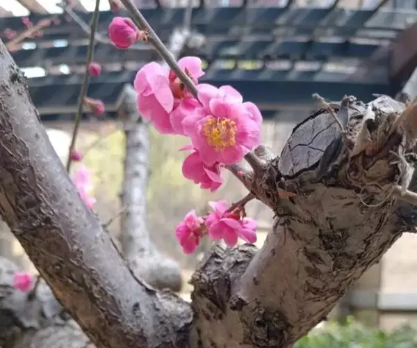 盆栽梅花应放在通风向阳处养护,过密或环境荫蔽,使植株高而细弱,冬季多晒太阳则花芽饱满粗壮,花色艳丽,姿态美观。若控制树形,促使幼树提早开花,需适时修剪整形。梅花的花芽是在一年生的新生枝条上形成的,一般当幼苗长至25-30厘米时,剪去顶端,萌芽后留顶端3-5个枝条作主枝,当枝条长到约20厘米左右时,摘心,以利花芽饱满。次年,花后留基部2-3个芽重剪,剪时应注意剪口芽的方向,选准外向芽,内向芽。发芽后剪除交叉枝、过密枝、重叠枝。盆梅因直则无姿、正则无景、密则无态,应按“疏、欹、曲”而又不矫揉做作的原则进行修剪。