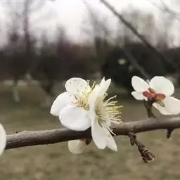 梅(学名:Armeniaca mume Sieb.):小乔木,稀灌木,高4-10米;树皮浅灰色或带绿色,平滑;小枝绿色,光滑无毛。叶片卵形或椭圆形,叶边常具小锐锯齿,灰绿色。花单生或有时2朵同生于1芽内,直径2-2.5厘米,香味浓,先于叶开放;花萼通常红褐色,但有些品种的花萼为绿色或绿紫色;花瓣倒卵形,白色至粉红色。果实近球形,直径2-3厘米,黄色或绿白色,被柔毛,味酸;果肉与核粘贴;核椭圆形,两侧微扁。花期冬春季,果期5-6月。2n=16,24。