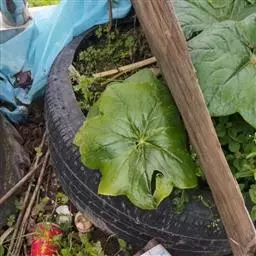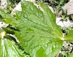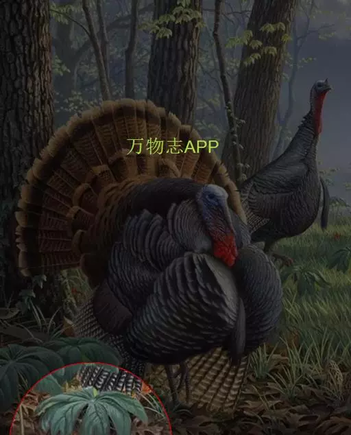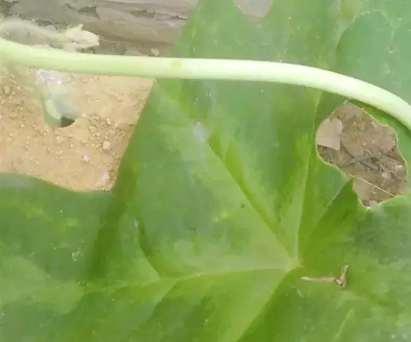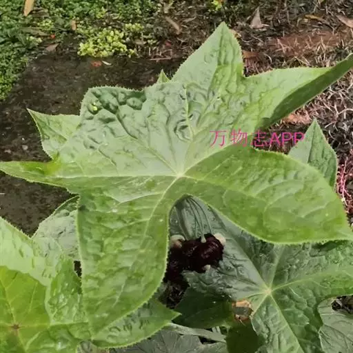 茎生叶2枚,薄纸质,互生,盾状,近圆形,直径达30厘米,4-9掌状浅裂,裂片阔三角形,卵形或卵状长圆形,长2.5-4厘米,基部宽5-7厘米,先端锐尖,不分裂,上面无毛,背面被柔毛,叶脉明显隆起,边缘具细齿;下部叶的柄长12-25厘米,上部叶柄长1-3厘米。