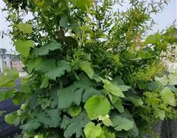 ⑶漏斗式棚架(扇形架)应用于地形较复杂地段,可以集中改良一小块土地,栽植4-5株葡萄,采用大肥大水的管理方法,使葡萄蔓向四周或扇面形方向引绑。其架式也按这类形状搭成,架根高1.0-1.5米,而周围架梢高2.0-2.5米,形成漏斗状或扇状。此类架式在我国河北省宣化、甘肃省兰州等地区采用较普遍。还可在公共场所作乘凉荫棚或用以遮盖建筑物等。