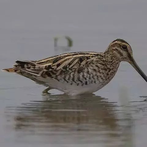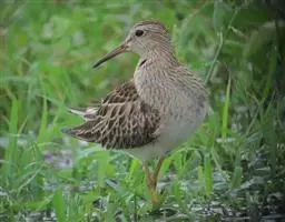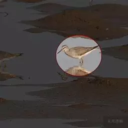 红脚鹬:体长28厘米,上体褐灰,下体白色,胸具褐色纵纹。飞行时腰部白色明显,次级飞羽具明显白色外缘。…