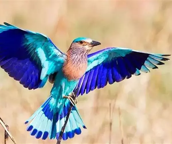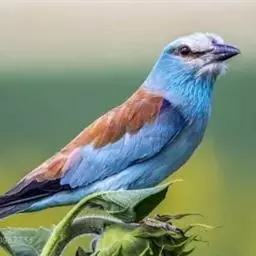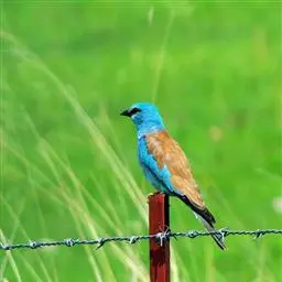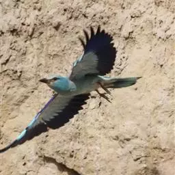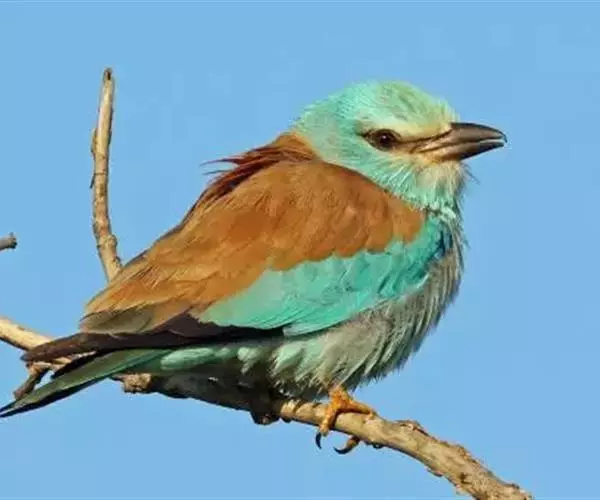 蓝胸佛法僧(学名:Coracias garrulus)中型鸟类,体长31~33厘米,通体淡蓝绿色。翅膀长而宽,除栗色背羽外大部分为蓝色。额、眼先、耳羽淡褐色;头顶、颊、腰淡蓝绿色。背、肩、最内侧数枚飞羽沙棕色。翼覆羽绿蓝色,小,中覆羽端部沾沙棕色,其余飞羽黑褐色。尾上覆羽、尾羽褐色。覆羽沾满绿蓝色。颏近白色,喉以下淡绿蓝色,喉至胸沾淡黄褐色。翅膀前缘鲜中蓝色,翅尖黑色。翅和尾上有一淡蓝色斑。