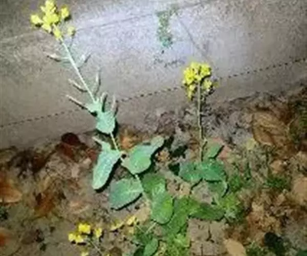 一年或二年生草本,高25-70厘米,无毛,带粉霜;根粗,坚硬,常成纺锤形块根,顶端常有短根颈;基直立,有分枝。基生叶倒卵形或宽倒卵形,长20-30厘米,坚实,深绿色,有光泽,基部渐狭成宽柄。全缘或有不显明圆齿或波状齿。中脉白色。宽达1.5厘米,有多条纵脉;叶柄长3-5厘米,有或无窄边;下部茎生叶和基生叶相似,基部渐狭成叶柄;上部茎生叶倒卵形或椭圆形,长3-7厘米,宽1-3.5厘米,基部抱茎,宽展,两侧有垂耳,全缘,微带粉霜。总状花序顶生,呈圆锥状;花浅黄色,长约1厘米,授粉后长达1.5厘米;花梗细,和花等长或较短;萼片长圆形,长3-4毫米,直立开展,白色或黄色;花瓣长圆形,长约5毫米,顶端圆钝,有脉纹,具宽爪。长角果线形,长2-6厘米,宽3-4毫米,坚硬,无毛,果瓣有明显中脉及网结侧脉;喙顶端细,基部宽,长8-12毫米;果梗长8-30毫米。种子球形,直径1-1.5毫米,紫褐色,有蜂窝纹。花期4月,果期5月。