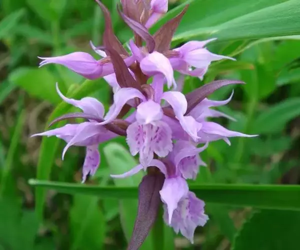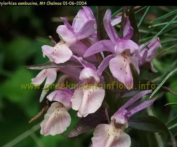 植株高约25厘米。假鳞茎很短,粗约7毫米,具2枚鞘和3-4枚叶。假茎长约3厘米。叶在花期全部展开,椭圆形或长圆形,长8-11厘米,中部宽2.5-3.5厘米,先端短渐尖,基部收狭为长约1厘米的柄,两面无毛;花葶出自叶丛中央,直立,长24厘米,被短柔毛;总状花序长约4厘米,疏生少数花;花序柄常被两枚筒状鞘;花苞片卵状披针形,长约1厘米,先端渐尖;花梗和子房长约2厘米;萼片和花瓣淡黄色,具紫红色的脉纹;中萼片卵状披针形,长1.7厘米,中部宽5毫米,先端渐尖,具5条脉;侧萼片斜卵状披针形,与中萼片近等大,先端渐尖,具3-5条脉;花瓣线形,长1.3厘米,中部宽2毫米,先端渐尖,具2-3条脉;唇瓣白色,基部与整个蕊柱翅合生,基部上方3裂;侧裂片斜椭圆形,比中裂片小,先端稍钝,边缘稍具齿;中裂片近肾形或横长圆形,先端近截形并微凹,边缘波状;唇盘上具7条鸡冠状褶片,其中3条褶片较长并延伸到中裂片先端;距短而劲直,长2-3毫米,末端钝,外面被短柔毛;药帽近半球形,前端收狭而呈喙状;花粉团倒卵球形,具很短的花粉团柄;蕊喙2裂,裂片牙齿状三角形。花期7月。