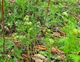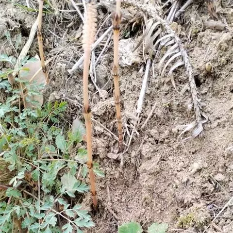 问荆(学名:Equisetum arvense L.):是木贼纲、木贼科、问荆属中小型蕨类植物。根茎黑棕色,地上枝当年枯萎。枝二型。高可达35厘米,黄棕色,鞘筒栗棕色或淡黄色,栗棕色,狭三角形,孢子散后能育枝枯萎。不育枝后萌发,鞘齿三角形,宿存。侧枝柔软纤细,扁平状,孢子囊穗圆柱形,顶端钝,成熟时柄伸长。